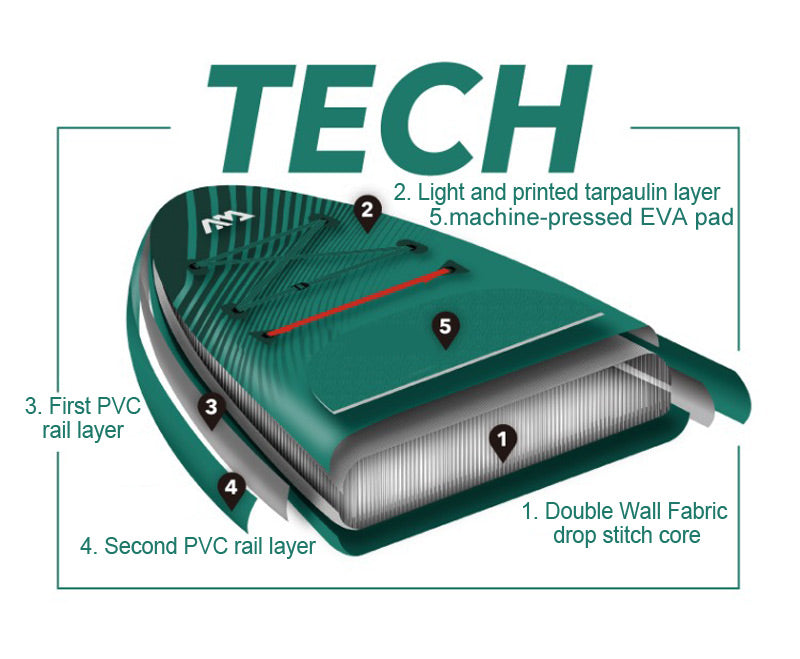 300*76*12cm, (9'10"*30"*4.7"), 229L volume, 7.6kg net weight, max payload 100kg, max air pressure 15PSI